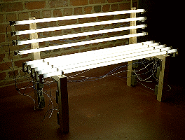 This is a cheap version of an idea Dirk had. As he didn't have any money to make the work, he used the lamps from his studio. It's a very dangerous work: touch it and die!