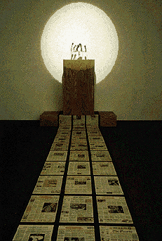 videotapes made from television...The lectern, bristling with microphones but no speaker, exemplifies this discontent while shrieking headlines of the